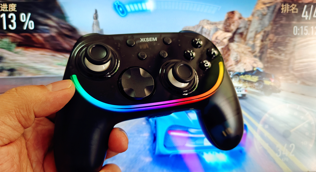 竞速游戏其实很能体现扳机键的好坏,油门和刹车是否有层次,直接影响驾驶手感。西圣GC1的沉浸式高精度L/R扳机行程设计比较合理,按压过程中能明显感受到力度变化,在需要精细控制速度的时候,比那种“一按到底”的手柄要友好得多。方向控制也比较稳定,不会出现轻轻一推就偏得很夸张的情况。